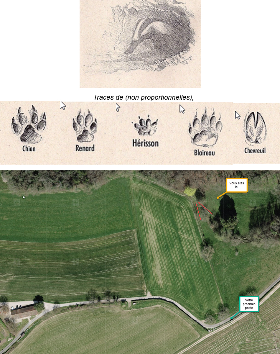 Versuchen Sie beim Ausgang des kleinen Tunnels, unterhalb der Wiese, seinen Fussabdruck oder den Fussabdruck einer anderen Spezies zu entdecken.